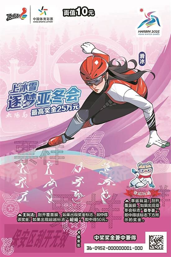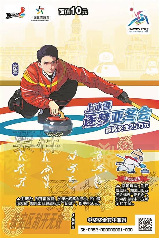 2025年2月7日至14日,第九届亚洲冬季运动会在黑龙江哈尔滨举办。在这场冰雪盛会到来之际,体彩顶呱刮推出“上冰雪 逐梦亚冬会”主题票面,与购彩者们一同开启一场充满激情与梦想的冬季之旅。