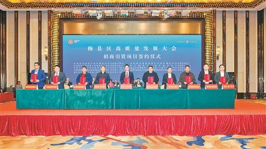 梅县沃土,春潮涌动。2月11日,梅州市梅县区召开高质量发展大会,传达省、市高质量发展大会精神,表彰2024年度梅县区纳税10强企业和“双联双建”助力绿美梅县生态建设优秀企业、商会代表,现场举行投资总额约32亿元的签约仪式,吹响了新一年高质量发展的号角。