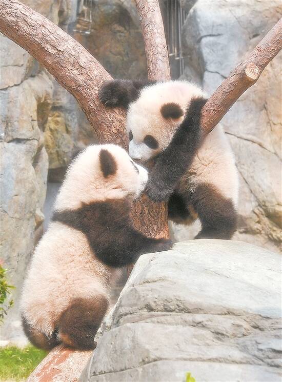 活动现场,香港海洋公园公布了两只大熊猫宝宝的成长短片。出生时,雌性大熊猫宝宝重约122克,雄性大熊猫宝宝体重约112克。在香港海洋公园护理团队24小时的轮流照顾下,目前它们的体重已经上升至十多公斤。它们从蹒跚学步、跌跌撞撞,成长为性格活泼、身手敏捷的“爬树高手”。