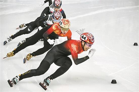 2月8日,中国选手孙龙(前一)与林孝埈(前二)在第九届亚冬会短道速滑男子500米决赛中。林孝埈摘下中国短道速滑队在本届亚冬会的第一枚金牌