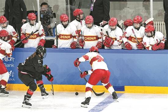 2月14日,女子冰球项目最后一场循环赛,中国队与日本队在比赛中拼抢