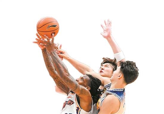 上海队球员布莱德索(左)在比赛中拼抢