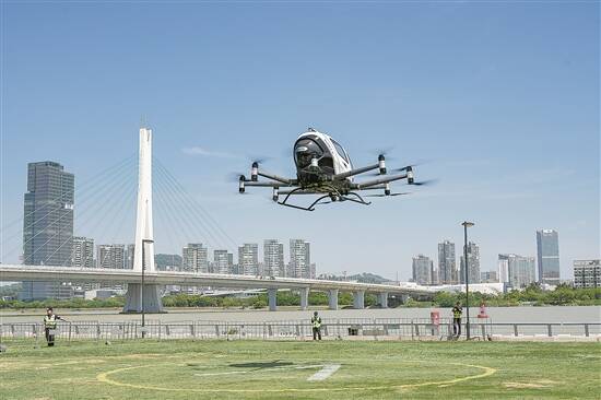 一架eVTOL无人驾驶电动垂直起降飞行器EH216-S正在广州南沙灵山岛水舞广场起飞 龚吉林 摄(资料图)