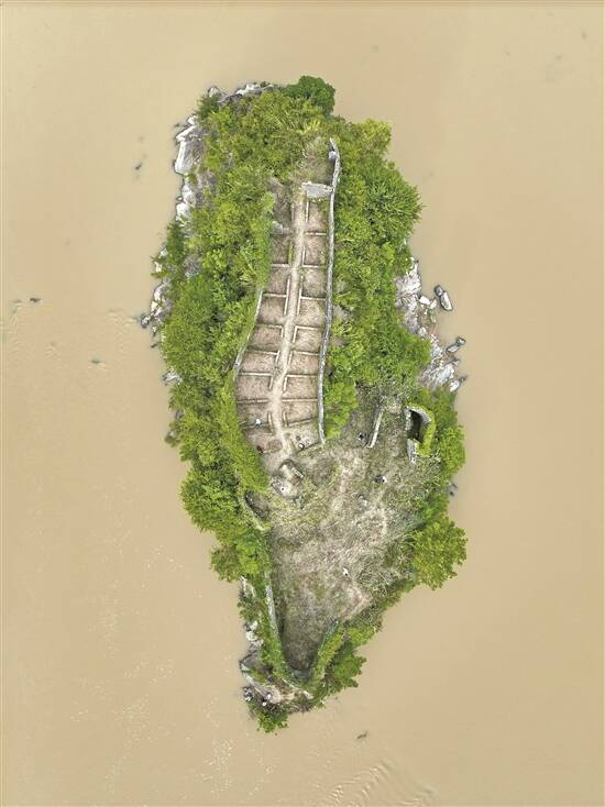在当地居民的帮助下,记者一行和考古队员小心绕过江面下的礁石,越过滩涂。登上小岛后可以看到,“书堂石”遗址为三层结构,最顶层仍可辨认出18间书房的建筑布局。