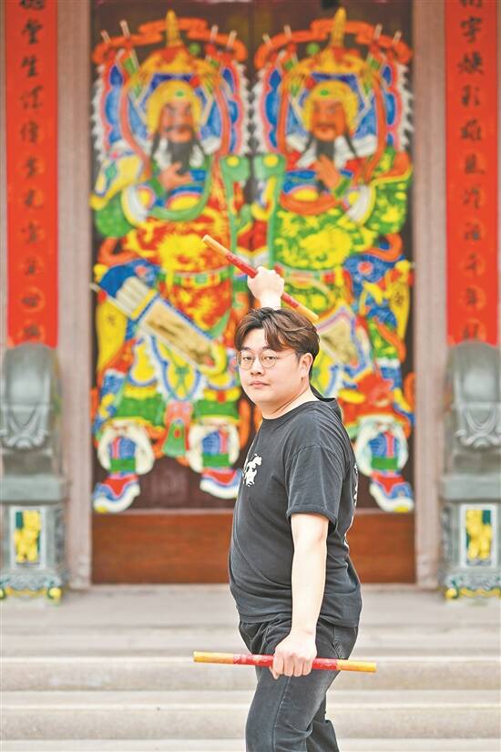 陈汉森在广州做电商运营,这次饰演“小李广花荣”,他说:“小时候在家就已经拿水管学着英歌比动作了。英歌舞的气势和正装出游的氛围都非常吸引我。而且既可以锻炼身体,又可以传承民俗文化。”