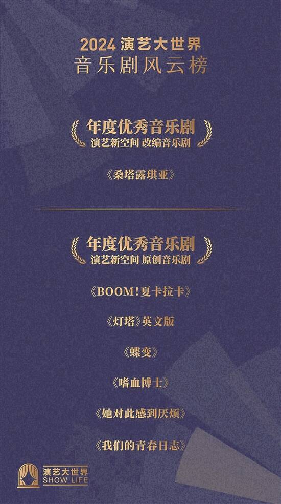 2月24日,“2024演艺大世界音乐剧风云榜”的颁奖活动在上海文化广场举行,主榜单及4个单项奖、3个大众投票奖随之出炉。
