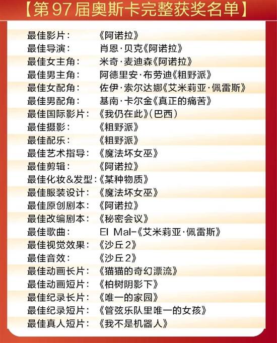 北京时间3月3日,第97届奥斯卡颁奖典礼在洛杉矶杜比剧院举办。电影《阿诺拉》成为最大赢家,斩获最佳影片、最佳导演、最佳女主角、最佳原创剧本、最佳剪辑共5项大奖。米奇·麦迪森凭借《阿诺拉》收获最佳女主角奖,最佳男主角则花落《粗野派》阿德里安·布劳迪。
