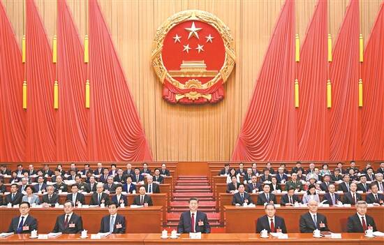 人民大会堂大礼堂气氛庄重热烈,主席台帷幕正中的国徽与会场穹顶上的五角星灯交相辉映。