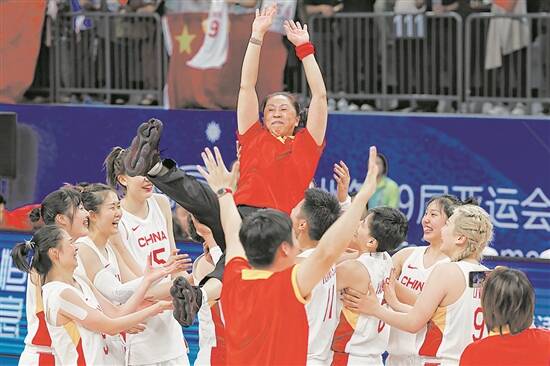 杭州亚运会,中国女篮队员夺得冠军后将郑薇高高抛起庆祝