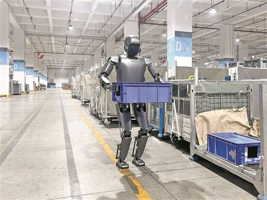 人形机器人正在比亚迪汽车生产线接受搬运实训 资料图片