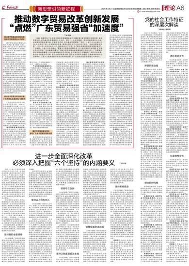 党的二十届三中全会审议通过的《中共中央关于进一步全面深化改革、推进中国式现代化的决定》(以下简称《决定》)明确了进一步全面深化改革必须贯彻的六大原则,必须坚持党的全面领导、坚持以人民为中心、坚持守正创新、坚持以制度建设为主线、坚持全面依法治国、坚持系统观念。这“六个坚持”既是对改革开放以来特别是新时代全面深化改革宝贵经验的科学总结,又是党不断深化对改革的规律性认识的重大成果,同时也是习近平总书记关于全面深化改革重要论述的核心要义。