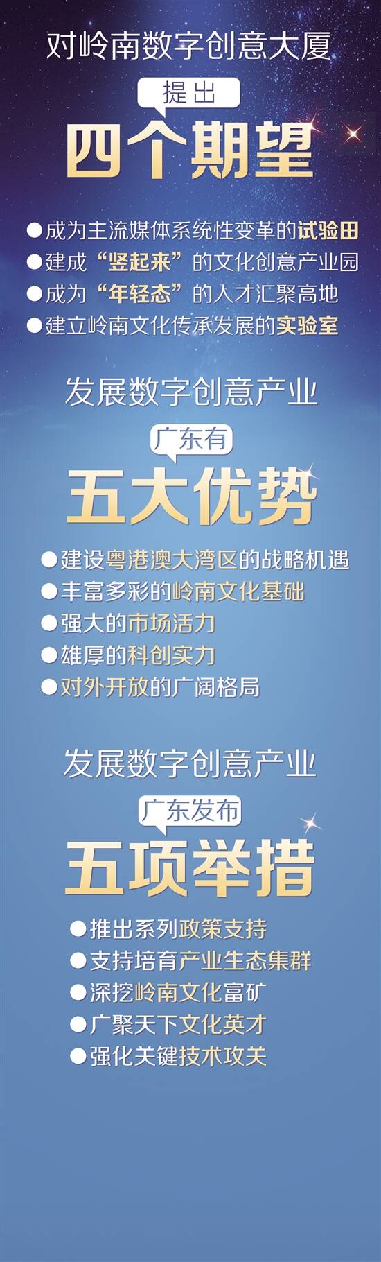会议对岭南数字创意大厦提出了四个期望。要把岭南数字创意大厦打造成为主流媒体系统性变革的试验田,汇聚更多新型文化业态,赋能“新闻+政务服务商务”,为媒体改革发展注入新动能;建成“竖起来”的文化创意产业园,吸引更多具有垂直优势和辐射能力的头部企业入驻,带动业态升级,为数字创意产业发展拓展新空间;成为“年轻态”的人才汇聚高地,用优秀企业、优质服务、优美环境招才引才,办好人才公寓、创业工坊、演艺剧场,为文化人才施展才华提供新舞台;建立岭南文化传承发展的实验室,夯实技术底座,推动岭南文化的数字化保存、智能化解析和产业化应用,为岭南文化“双创”增添新活力。