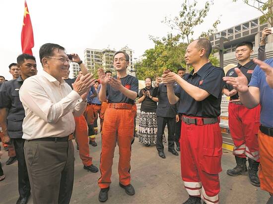 羊城晚报讯 记者王莉报道:记者从应急管理部获悉,4月6日下午,缅甸领导人敏昂莱来到曼德勒中国救援队伍营地慰问中国救援队、中国国际救援队、中国香港特区救援队全体成员,对中方救援队伍震后到缅全力救援表示感谢。