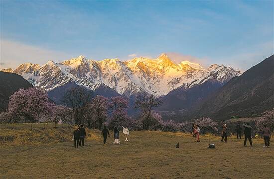 2025年4月6日,南迦巴瓦峰日照金山,金山与桃花相映如画