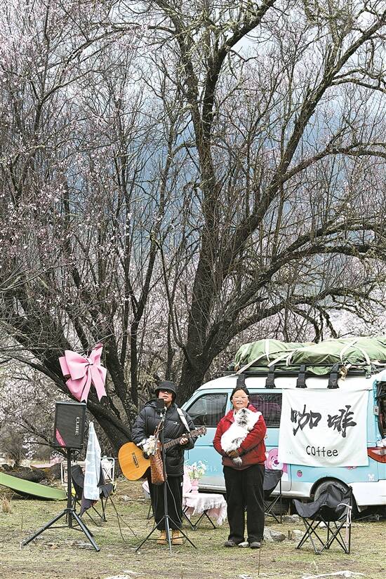 2025年4月4日,富贵(左)和丸子带着一只猫,把车子改装成移动咖啡店,在波密桃花沟的桃树下做起生意,一人弹唱吸引顾客,一人制作咖啡