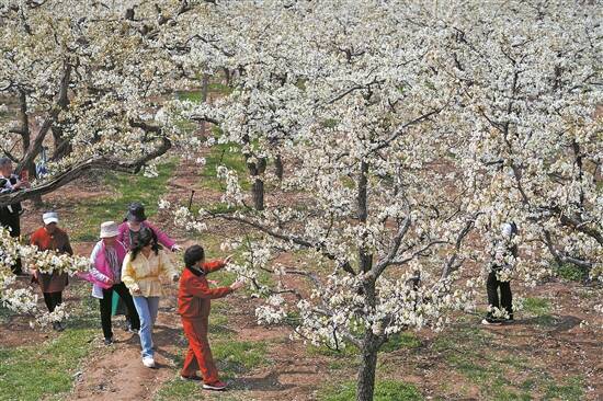 游客在阳信县万亩梨园中拍照打卡,流连忘返