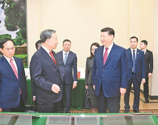 习近平指出,很高兴对越南进行国事访问,实现同苏林总书记的首轮互访。今年是越南共产党成立95周年、越南建国80周年和南方解放50周年,我代表中国共产党和中国政府向越方致以热烈祝贺。中方将一如既往支持越南走好符合本国国情的社会主义道路,胜利召开2026年越共十四大,朝着建党建国“两个一百年”奋斗目标不断迈进。