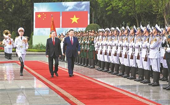 新华社河内4月14日电 4月14日,中共中央总书记、国家主席习近平抵达河内对越南进行国事访问。当日下午,越共中央总书记苏林为习近平举行隆重欢迎仪式。