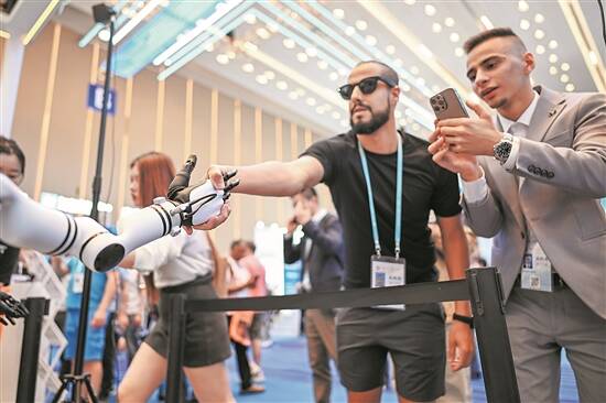服务机器人专区内,客商与机械手握手 羊城晚报记者 钟振彬 摄
