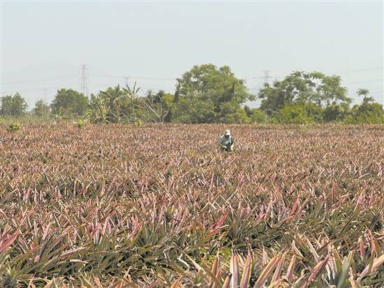 与此同时,台隆农业园第一批金钻凤梨也在4月上旬上市。由于地处咸淡水交界的地理位置,这里的金钻凤梨甜度可达20-22度,堪称水果自然甜度的天花板。陈希介绍:“平沙的盐碱地是咸淡水交汇形成的冲积土,微量元素丰富,种出的凤梨甜度更高。这批刚上市的凤梨果肉饱满多汁,入口即化,亩产值达3.2万-4万元。”