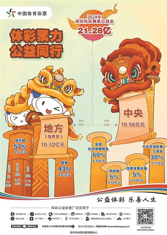 据了解,自1994年中国体育彩票全国统一发行销售以来,截至2024年年底,深圳体彩已累计筹集公益金193.82亿元。体彩公益金被广泛用于补充社会保障基金、红十字事业、教育助学、城乡医疗救助、赈灾救灾、乡村振兴和全民健身、竞技体育等社会公益事业。公益金分配根据相关规定统计,具体分配与使用以各级部门发布的年度公益金使用公告为准。 (文/图 胡彦 粤体彩)