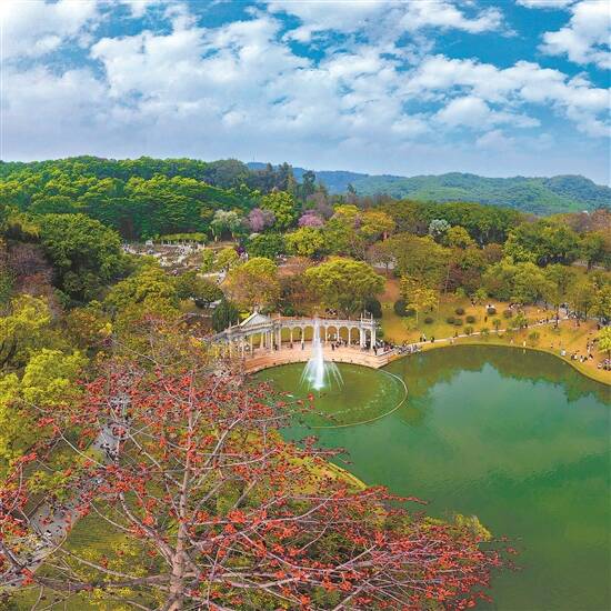 被誉为“花城明珠”的云台花园,以加拿大布查特花园为蓝本,打造出四季繁花似锦的莫奈式浪漫。郁金香织就的花毯、中西合璧的园林艺术等,使其成为家庭野餐、婚纱摄影的热门地。而大湾区唯一的空中观景植物园——云萝植物园,则以2公里木棉道横贯八大专类园,游客可站在形似花瓣的观景台俯瞰城市天际线,感受“见缝插绿”的生命力。