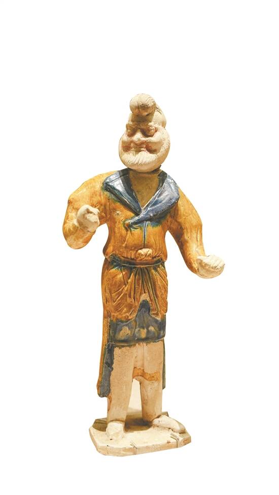 胡人是唐三彩艺术中的经典题材,生动展示了唐代丝绸之路上的异域人物形象,反映了唐代中外交流的繁荣景象。杜甫《黄河二首》诗云:“铁马长鸣不知数,胡人高鼻动成群。”描写的正是胡人结队成群的场景。