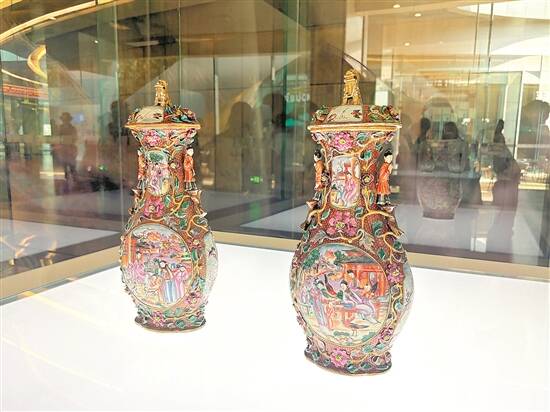 羊城晚报讯 记者周欣怡摄影报道:4月22日,“湾区瑰宝·广彩华章——粤港澳传统与当代广彩艺术展”在广州塔首层环形展廊启幕。展览展出近百件广彩精品,串联起岭南文化的历史传承与时代创新,为公众呈现一场跨越300年时空的广彩盛宴。本次展览将展至7月31日。