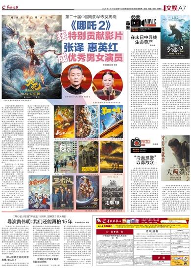 共筑电影梦,激扬时代情。恰逢中国电影的双甲子之年,第二十届中国电影华表奖颁奖活动在山东省青岛市举行,二十余部入围影片及其主创人员竞逐本届华表奖荣誉。最终,《第二十条》《流浪地球2》《三大队》《封神第一部:朝歌风云》《志愿军:雄兵出击》《万里归途》《我爱你!》《年会不能停!》《觅渡》和《长安三万里》获本届华表奖“优秀故事片”奖项。目前以超过157亿元票房位列全球影史票房榜第五名的国漫《哪吒之魔童闹海》(简称《哪吒2》)获得“特别贡献影片”荣誉。