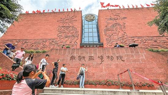 从白云山、越秀山到珠江边,恰好是广州传统中轴线和新中轴线的所在地。记者5月4日在传统中轴线区域看到,昔日树林郁郁葱葱,樵夫上山砍柴的“象山樵歌”场景如今虽已不存,但位于象岗山的南越王博物院(王墓展区)游人如织。记者在现场看到,不少游客在游毕旁边的越秀山后,直接下山到南越王博物院(王墓展区)打卡。南越王博物院(王墓展区)开设的“小赵的奇妙屋”文创商店更是吸引大批游客到访。