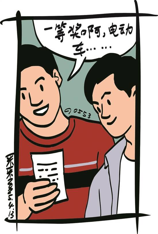 大牛抽完了,也没在意,让小虎帮他刮开。小虎惊叫了一声,说:“一等奖啊,电动车!”大牛不相信,小虎一再强调:“你真的有新电动车骑了。”兑奖后,大牛推着新电动车,还是觉得自己在做梦。后来,小虎托人帮忙找了收旧电动车的人拉走了大牛的旧电动车。大牛骑上新电动车,才相信这一切都是真的。