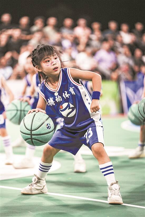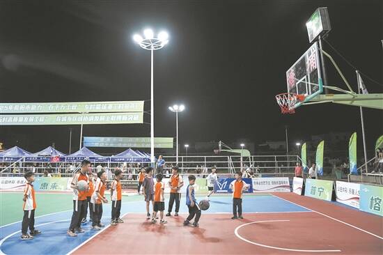 每晚比赛结束,球员与观众离席散去,体育广场就会再次被篮球“生力军”所占领。孩童们模仿起篮球比赛中的一招一式,传球、运球、投篮,虽稍显稚嫩,但洋溢着青春的朝气。“等再高一点,我们也去比赛。”嬉笑中,不知道谁提了这么一嘴,就立即迎来了同伴们的附和。