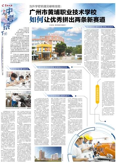 作为广州制造业强区黄埔的职教标杆,广州市黄埔职业技术学校(以下简称“黄埔职校”)为区域战略性新兴产业输送大批“零磨合”技术人才——在这里,部分课程中实操占比超六成,技能竞赛课题化身教学案例,中考450分以上学生通过职教赛道升入“双高”院校概率达95%,技能竞赛获奖者直通高职院校成常态……