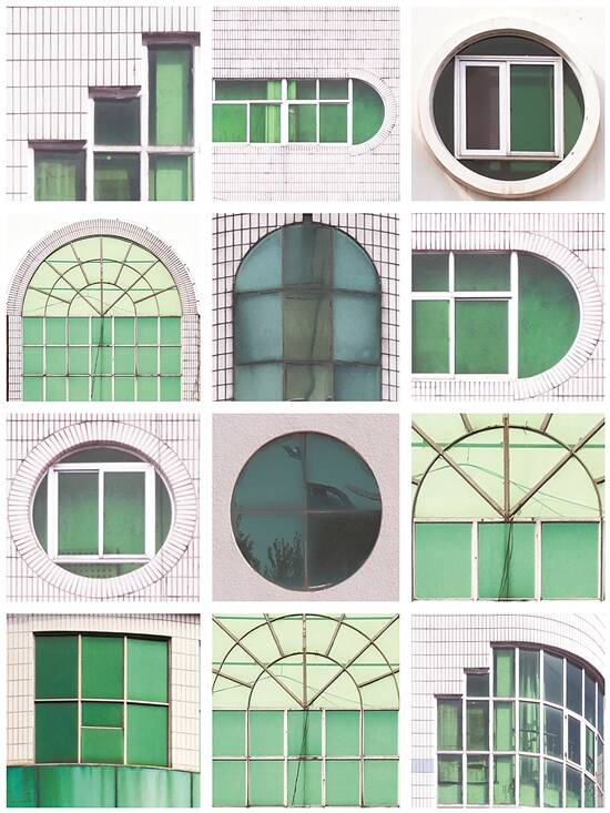 今年23岁的刘育嘉已走过全国150多个城市,拍摄近万张建于1980-2010年代的大楼照片。这些建筑有着各异的几何造型,墙体覆盖蓝色、茶色或绿色的玻璃幕墙,楼顶还有着圆柱型、立方体型乃至飞碟型的结构,颇有科幻色彩。