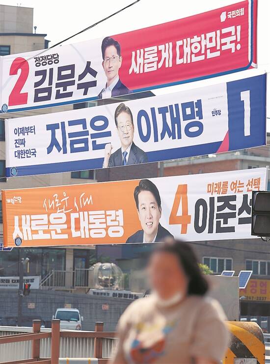 韩国总统选举冲刺,首尔街头悬挂着国民力量党候选人金文洙、共同民主党候选人李在明、改革新党候选人李俊锡的横幅 视觉中国供图