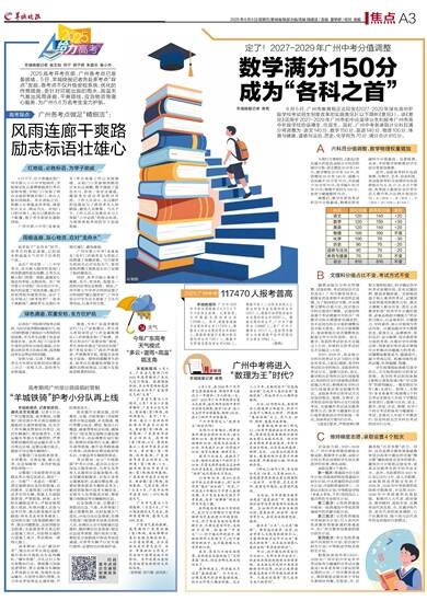 6月5日,在2025年广州中考志愿填报结束、明确中考人数比上一年增加1万人的这一天,2027-2029年广州中考改革方案正式发布,敲定两年后的中考科目分值大调整:数学150分、在三大主科中分值最高,物理100分、在4门副科中分值最高。