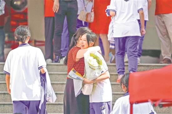 9日,高考结束,在广州市第十六中学考点,考生与等候的老师热情相拥 羊城晚报记者 邓鼎园 摄