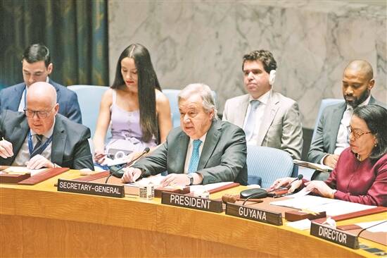 联合国秘书长古特雷斯(前中)在安理会就美国打击伊朗核设施召开的紧急公开会上发言 新华社发