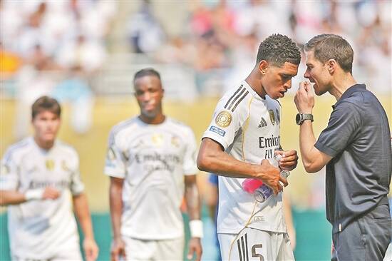 皇马主教练阿隆索(右)在比赛中指导球员贝林厄姆 新华社发