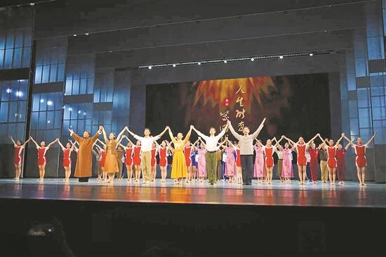 在《人生能有几回搏》舞剧最后演出环节,运动员代表与现场观众互动,现场氛围热烈,掌声雷动。