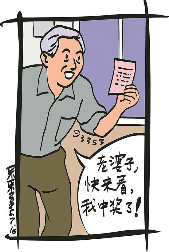 第二天早饭后,老方到楼道的报箱里取了报纸,回来先泡一杯茶,之后拿起报纸翻到彩票版查看昨日的开奖信息。突然,老方心里猛地一惊,忙找出昨天买的彩票核对。