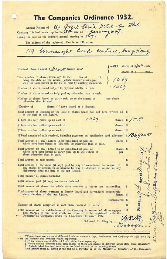 香港特区政府政府档案处提供的大中华酒店档案资料共有四份,主要包括1941年7月土地档案、1950年7月公司章程、1950年公司条例、1956年经营报告。这些档案可以显示:大中华酒店成立于1928年,酒店建筑物位于干诺道中(Connaught Road Central)119至120号和德辅道中(Des Voeux Road Central)237、239号,酒店建筑物楼高五层,其中干诺道中120号地面层前座用作理发店,德辅道中237、239号地面层用作餐厅。