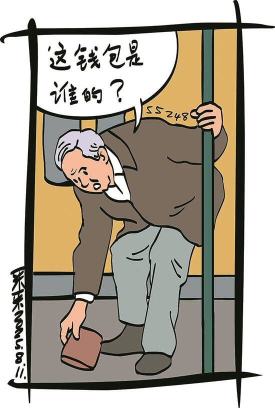 车厢中前部,一位头发花白的老者弯腰从脚边捡起个半旧钱包,举起来问:“这钱包是谁的?”见没人应答,他又提高音量重复了一遍:“有谁丢了钱包?”