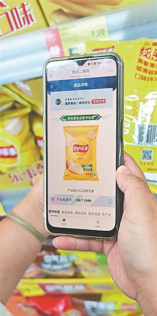 9月8日,羊城晚报记者走访了广州市场。在天河区一家大型超市,乐事旗下多款袋装薯片已使用数字标签。扫码后,可以看到“预包装食品数字标签”抬头,标签内容涵盖商品信息、原料信息、企业信息、生产批次。点开批次信息后,还可以看到这包薯片是由哪家分厂生产的、生产日期以及企业食品生产许可证、营业执照等信息。