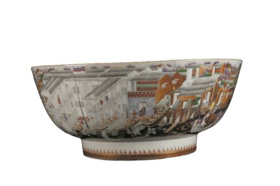 这种大碗是欧洲人在宴会上调盛果酒之用,也称潘趣碗。外壁以通景彩绘方式描绘了广州十三行商馆的面貌,上面绘有丹麦,大革命前的法国、奥地利等国的国旗,还有粤海关以及无数的小船、正在谈话的中外商人贸易等场景。品相完整,色彩鲜艳,画工精湛,描绘的人物、建筑场景众多,栩栩如生,气势磅礴,是乾隆时期一件不可多得的精品之作。