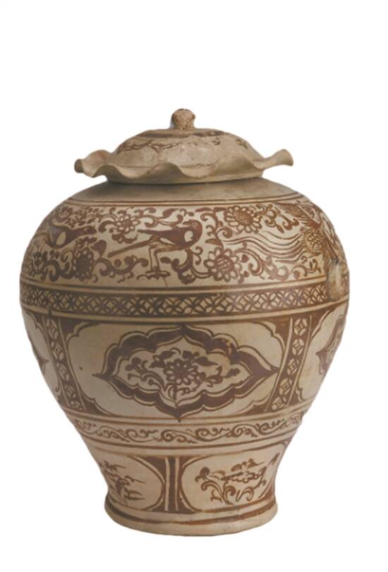 ■元雷州窑釉下褐彩凤鸟纹荷叶盖罐