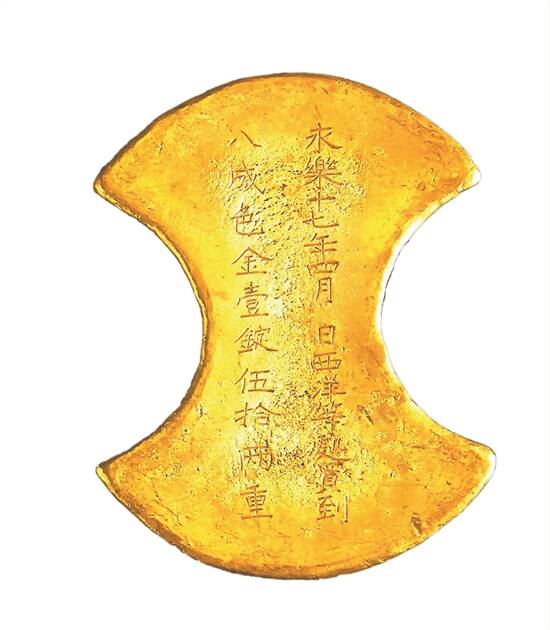 金锭2002年出土于湖北省钟祥明代梁庄王墓,正面铸有“永乐十七年四月 日西洋等处买到/八成色金壹锭伍拾两重”铭文。永乐十七年是1419年,正是郑和第五次下西洋归来之时,从铭文可知,这件金锭是郑和船队于返回途中用在西洋所买的一批黄金制作的。“西洋”是当时泛指明朝南海以西的海洋,包括印度洋及其沿海地区。