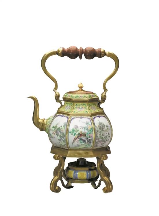 提梁壶铜胎鎏金,八棱形,腹部八面开光饰四季花鸟与山水图案。壶底施白珐琅釉,蓝珐琅双栏内署仿宋体“乾隆年制”竖行四字款。
