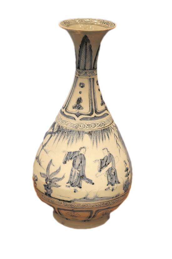 元青花大多来自海外进口的钴料,见证了元朝中国对海外贸易的扶持和参与,以及当年国际贸易的公平互利。元青花因传世器物稀少而弥足珍贵,该件玉壶春瓶因为绘有人物故事图而更显难得,是中西文化交流的典型产物。