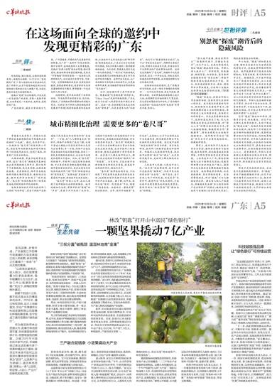 随着集体林权制度改革的深化,阳春坚果产业已形成覆盖一二三产的全产业链集群发展格局。这颗小坚果撬动的,是一个年产值逾7亿元的“大产业”。“我们与华南理工大学、中国热带农业科学院等科研院所合作,开发出坚果油、活性炭等高值产品,还规划建设‘农文旅风光电互补’的立体农业项目。”廖景云介绍道,公司通过混合所有制改革引入投资,依托1.5万多亩林地规划建造集种植示范、加工体验、生态观光于一体的林业产业园,让坚果林不仅能产果,还能引客、留客。